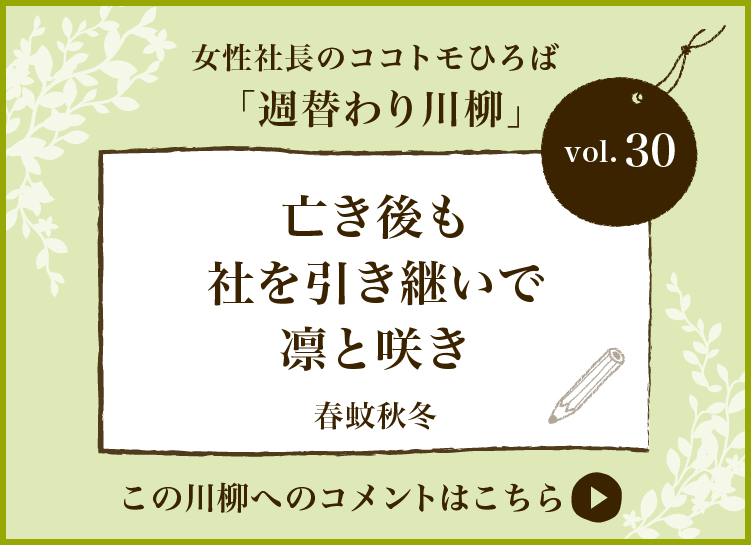 この川柳は、姉妹サイト「つぐのわ」で行った『第2回「夫が社長」妻のつぶやき川柳』に、春蚊秋冬さんから応募いただいた作品です。 10月18日は「世界メノポーズデー」。 この日を通じて、女性が健康で...